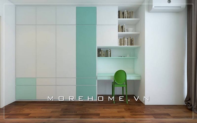 Tủ quần áo gỗ công nghiệp 4 cánh với lối thiết kế âm tường, kết hợp kệ sách bàn học giúp con thuận tiện hơn bao giờ hết