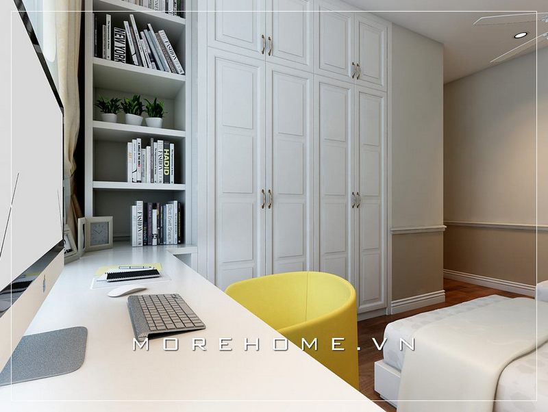 Trang trí nội thất phòng ngủ chung cư nhỏ ấn tượng, chiếc tủ áo màu trắng kết hợp kệ sách tiện dụng giúp không gian thêm gọn gàng, ngăn nắp hơn