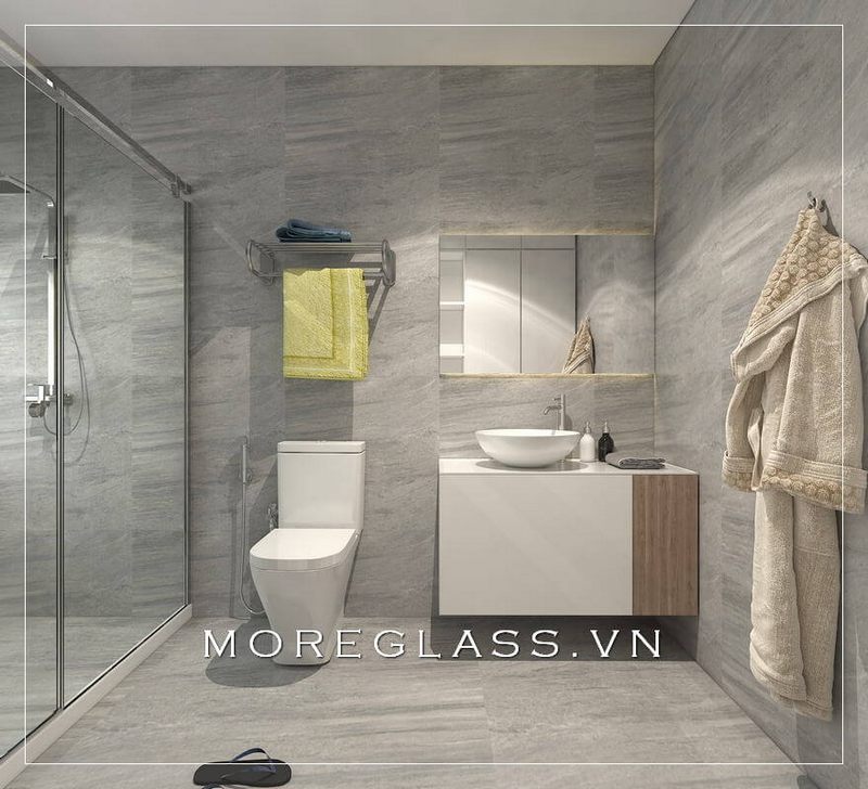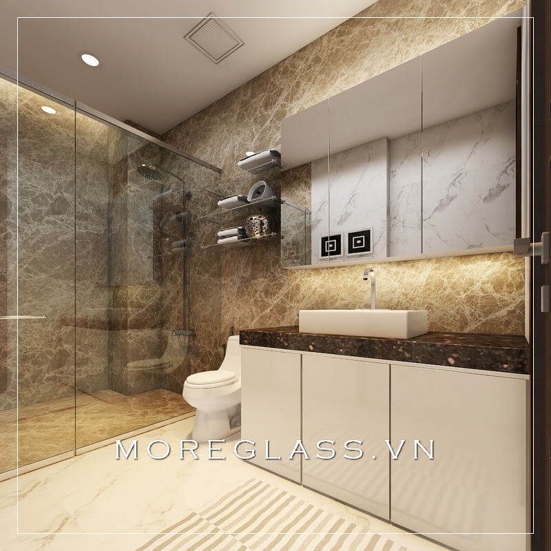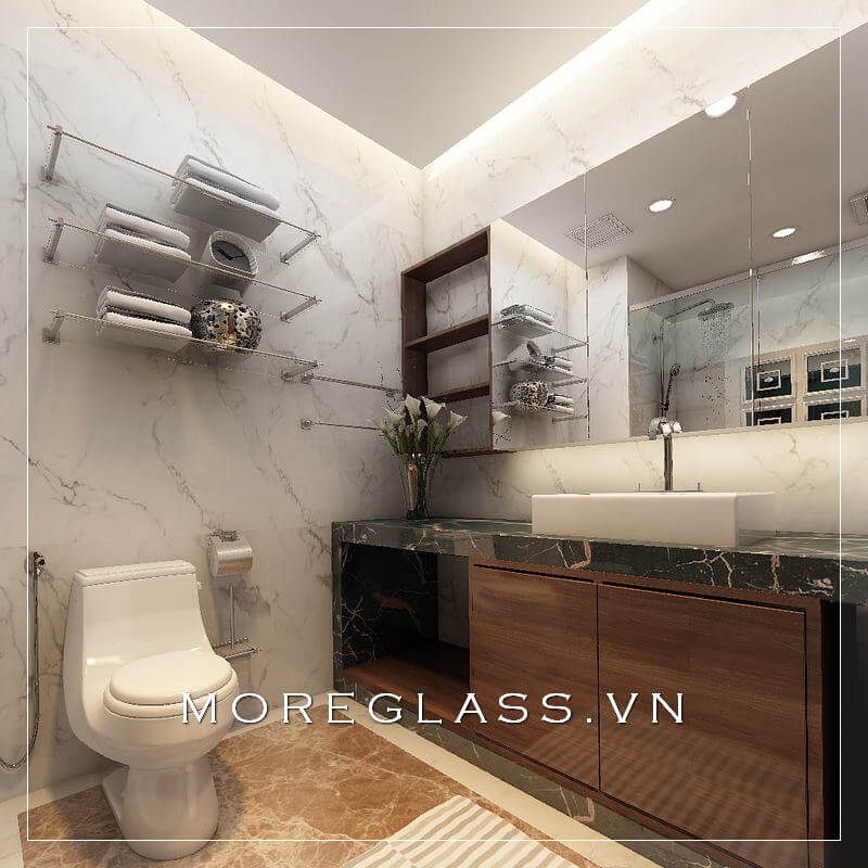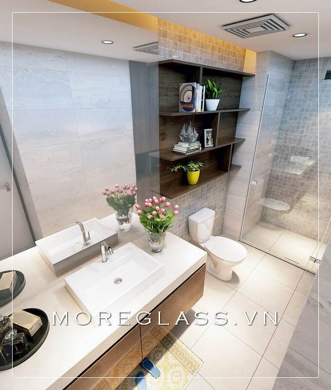 Mẫu thiết kế nhà tắm và nhà vệ sinh đẹp với kệ tủ trang trí, kệ tủ lavabo đơn giản, hiện đại cùng thiết bị vệ sinh, phòng tắm kính đẹp.