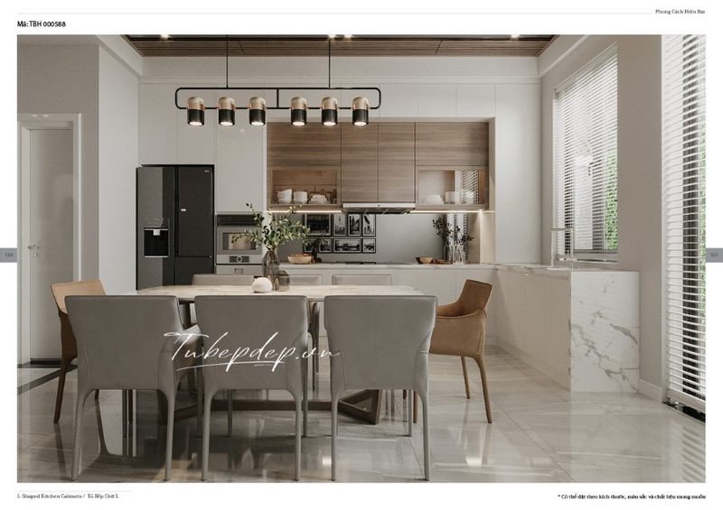 Bàn ăn được đặt gần ngay trong phòng bếp có thiết kế trẻ trung, hiện đại với tone màu nhẹ nhàng của nội thất tủ bếp gỗ công nghiệp và đá ốp bếp màu trắng vân mây tạo nên sự sang trọng.
