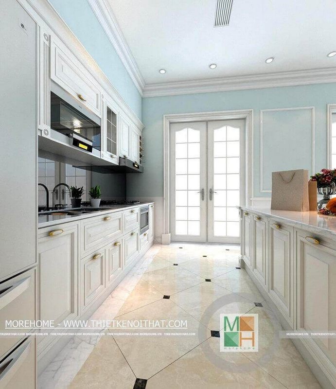 Phòng bếp tân cổ điển được thiết kế với nội thất màu trắng giúp tạo nên không gian sang trọng và thoáng đãng hơn.