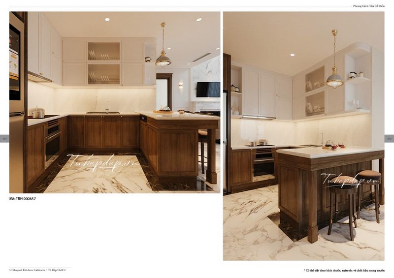 Tủ bếp gỗ óc chó chữ U theo phong cách tân cổ điển mang lại sự sang trọng cho không gian ấm cúng của ngôi nhà. Các kiến trúc sư thêm vào một ghế đơn để tạo thành quầy bar thông minh và sáng tạo.