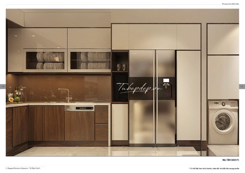 Mẫu tủ bếp hiện đại được thiết kế để phù hợp với các diện tích không quá lớn của biệt thự, nhà phố hay chung cư, cung cấp sự tối ưu hóa không gian với hệ thống tủ acrylic sáng bóng.